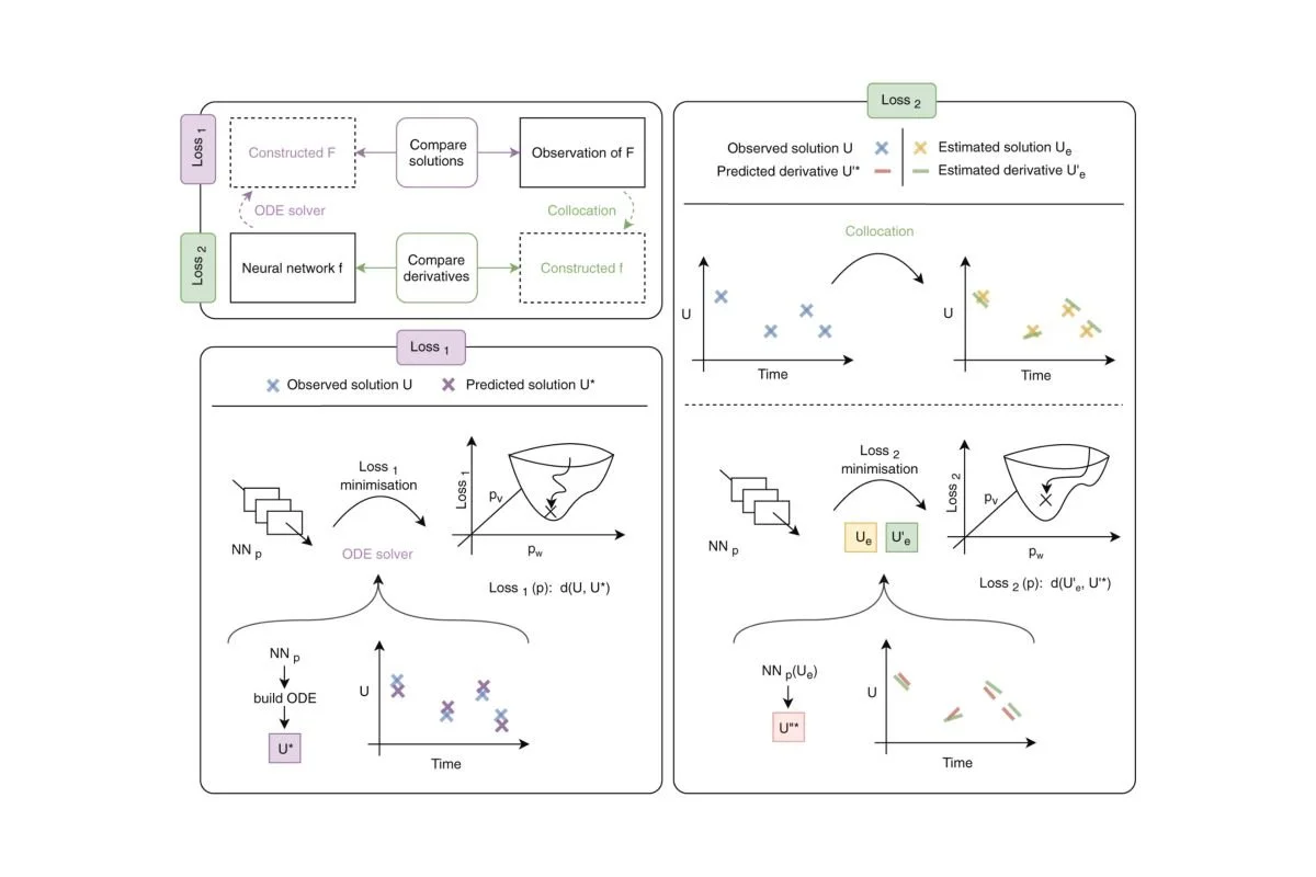 The predictive power of machine learning models often exceeds that of mechanistic modeling approaches. However, the interpretability of purely data-driven models, without any mechanistic basis is often complicated, and predictive power by itself can be a poor metric by which we might want to judge different methods. In this work, we focus on the relatively new modeling techniques of neural ordinary differential equations. We discuss how they relate to machine learning and mechanistic models, with the potential to narrow the gulf between these two frameworks: they constitute a class of hybrid model that integrates ideas from data-driven and dynamical systems approaches. Training neural ODEs as representations of dynamical systems data has its own specific demands, and we here propose a collocation scheme as a fast and efficient training strategy. This alleviates the need for costly ODE solvers. We illustrate the advantages that collocation approaches offer, as well as their robustness to qualitative features of a dynamical system, and the quantity and quality of observational data. We focus on systems that exemplify some of the hallmarks of complex dynamical systems encountered in systems biology, and we map out how these methods can be used in the analysis of mathematical models of cellular and physiological processes.
