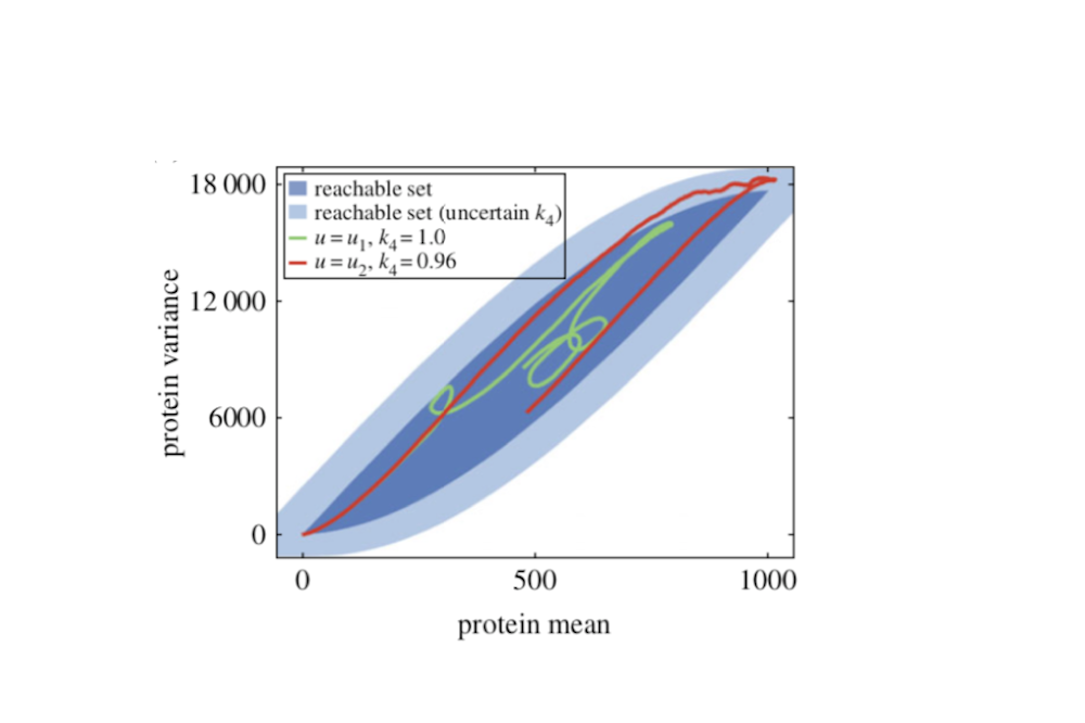 Controlling the behaviour of cells by rationally guiding molecular processes is an overarching aim of much of synthetic biology. Molecular processes, however, are notoriously noisy and frequently nonlinear. We present an approach to studying the impact of control measures on motifs of molecular interactions that addresses the problems faced in many biological systems: stochasticity, parameter uncertainty and nonlinearity. We show that our reachability analysis formalism can describe the potential behaviour of biological (naturally evolved as well as engineered) systems, and provides a set of bounds on their dynamics at the level of population statistics: for example, we can obtain the possible ranges of means and variances of mRNA and protein expression levels, even in the presence of uncertainty about model parameters.