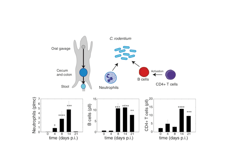 Tracking disease progression in vivo is essential for the development of treatments against bacterial infection. Optical imaging has become a central tool for in vivo tracking of bacterial population development and therapeutic response. For a precise understanding of in vivo imaging results in terms of disease mechanisms derived from detailed postmortem observations, however, a link between the two is needed. Here, we develop a model that provides that link for the investigation of Citrobacter rodentium infection, a mouse model for enteropathogenic Escherichia coli (EPEC). We connect in vivo disease progression of C57BL/6 mice infected with bioluminescent bacteria, imaged using optical tomography and X-ray computed tomography, to postmortem measurements of colonic immune cell infiltration. We use the model to explore changes to both the host immune response and the bacteria and to evaluate the response to antibiotic treatment. The developed model serves as a novel tool for the identification and development of new therapeutic interventions.